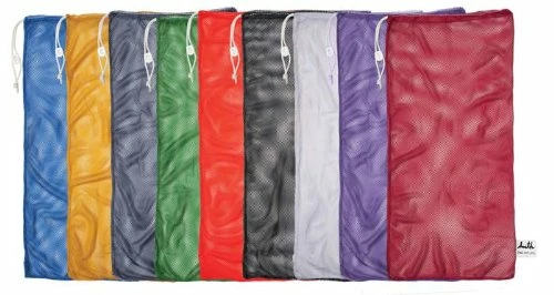 Champion Sports Mesh Equipment Bag Made of heavy-duty nylon with drawstring cord, lock and I.D. tag. Dimensions: 24” x 48”. Set of 6 colors: Gold, Green, Orange, Purple, Royal & Scarlet.