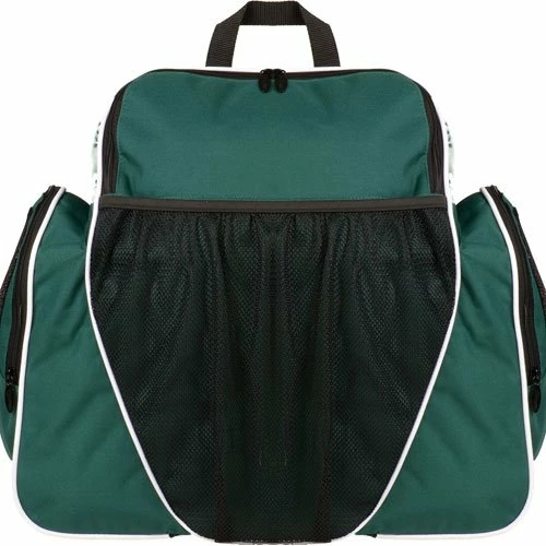 The Champion Sports Deluxe All Purpose Backpack allows you to carry and organize all of your sports equipment and personal possessions. This large bag is made of 600 Denier Polyester and features a top loading compartment with a U-shaped opening. There are several handy compartments for your equipment including a large ventilated pocket for footwear, a front mesh pocket that holds any size ball, and a small inner pocket and key tab for holding personal possessions. The bag also features padded, adjustable back straps and a web looped carrying handle for comfortable transport. The Deluxe All Purpose Backpack is available in your choice of black, royal blue, dark green, navy, and red.