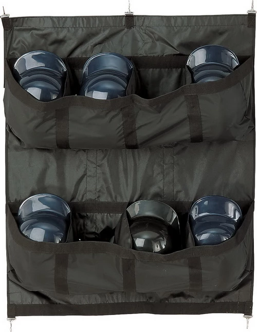 The Champion Sports HC1000 helmet caddy conveniently holds up to 8 helmets and attaches easily to a chain link fence. It’s constructed with heavy-duty reinforced vinyl and a mesh backing.