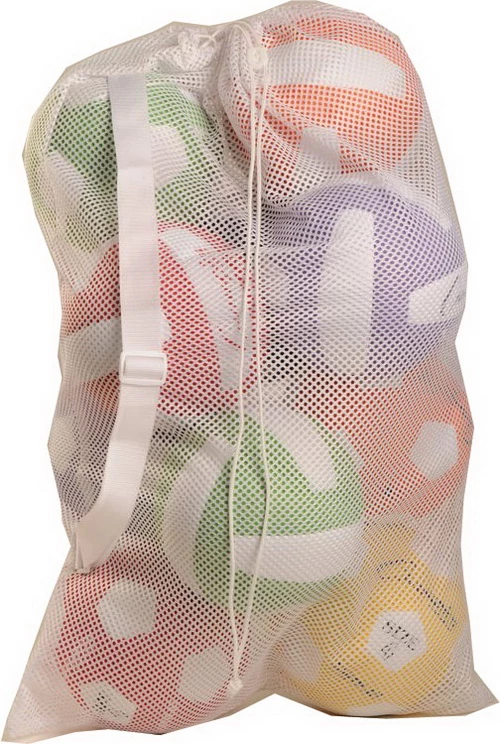 The Champion Sports Mesh Equipment Bag measures 24” by 48” and features a heavy-duty nylon mesh construction that can be used to carry sports gear and balls. It includes a drawstring cord with cord lock and an ID tag.
