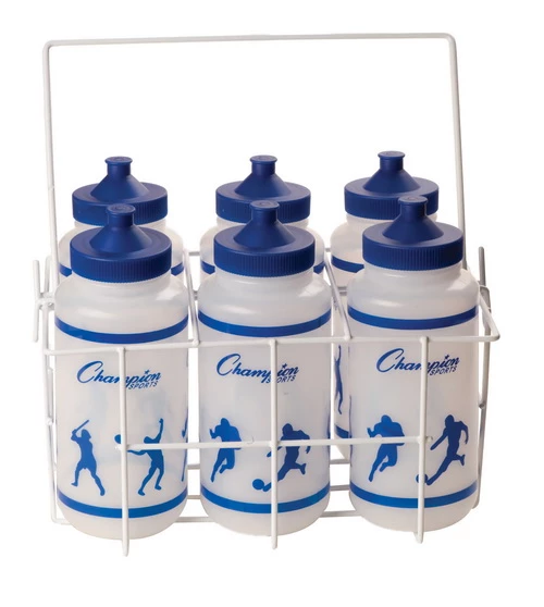 The Champion Sports Wire Water Bottle Carrier Set has everything you need to conveniently keep you team healthy and hydrated. Each set includes 6 plastic quart size bottles and a collapsible plastic carrier. The quart size bottles feature a wide mouth that is easy to use on the go. The carrier is made of coated wire.