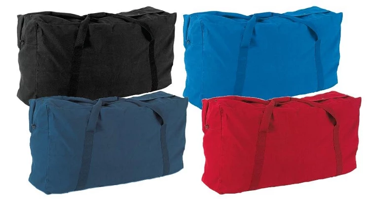 The Champion Sports 22 oz. Oversized Canvas Zippered Duffle Bag measures 42 in long, which is perfect for carrying a substantial amount. This canvas bag is extremely durable and features a zipper closure and carrying handles for easy handling.